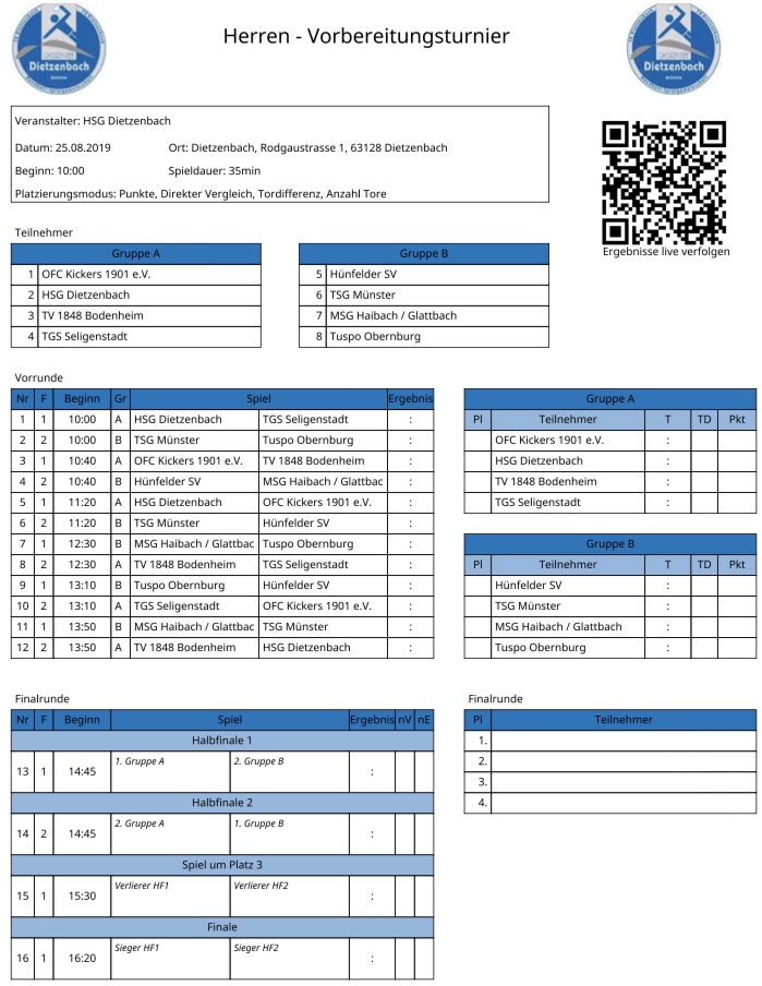 Das Turnier der Herrenmannschaften findet an diesem Sonntag, den 25. August statt und startet um 10 Uhr morgens in der Philipp-Fenn-Halle (Feld 1) und Ernst-Reuter-Halle (Feld 2) // Leider musste spontan die MSG Haibach/Glattbach ihre Mannschaft aus personellen Gründen abmelden
