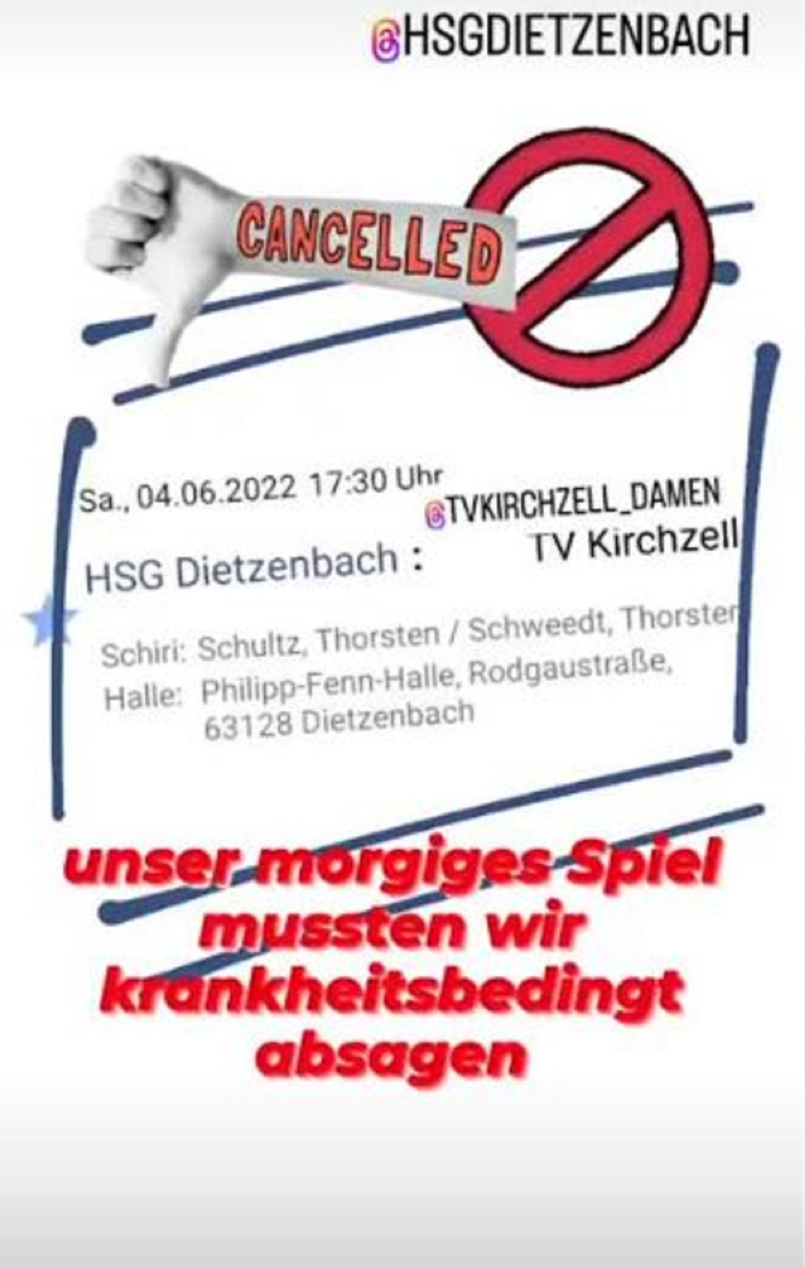 Absage 1. Damen gegen TV Kirchzell für Samstag, den 4. Juni 2022